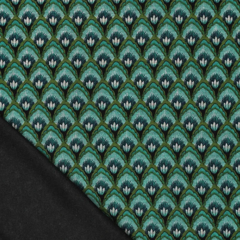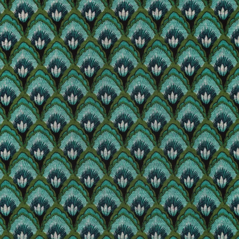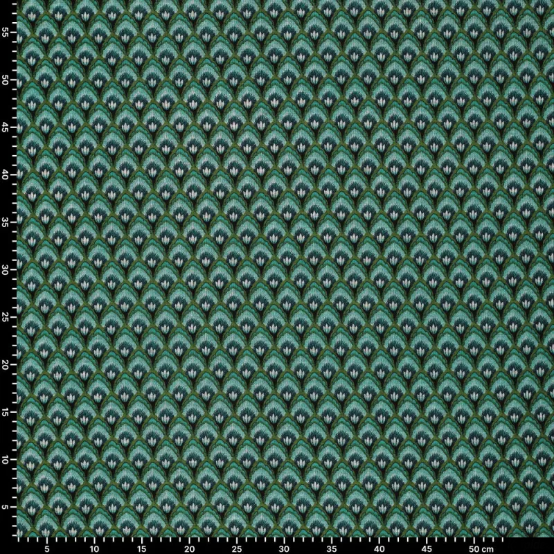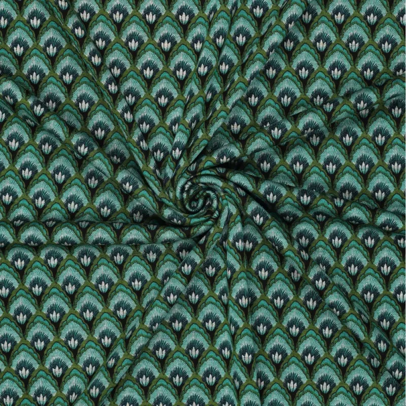 La tela Roma Shell Ornament de La Mercerie Café Bouton es una maravillosa tela con estampado decorativo ornamentado en tonos verdes. Con una composición de 59 % poliéster y 41 % viscosa, ofrece una textura suave, un peso de 240 g/m² y un ancho de 150 cm. Cumple con la certificación Oeko-Tex Clase 2.